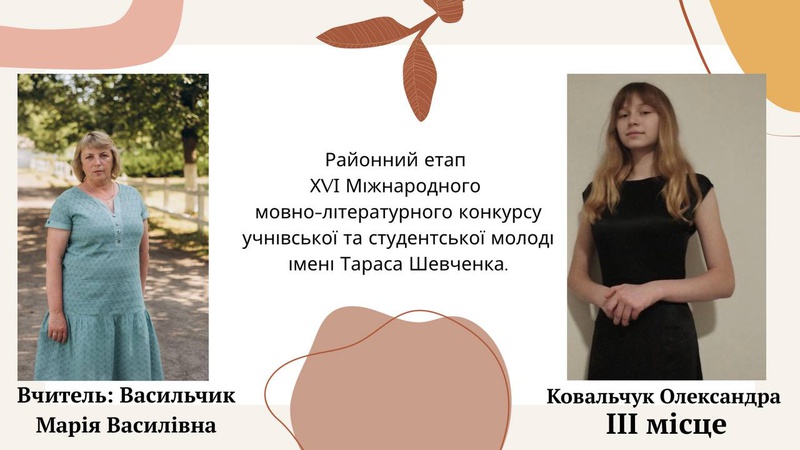 Щиро вітаємо талановиту ученицю 9-А класу Олександру КОВАЛЬЧУК із здобуттям ІІІ місця у районному етапі ХVІ Міжнародного мовно-літературного конкурсу учнівської та студентської молоді імені Тараса Шевченка.